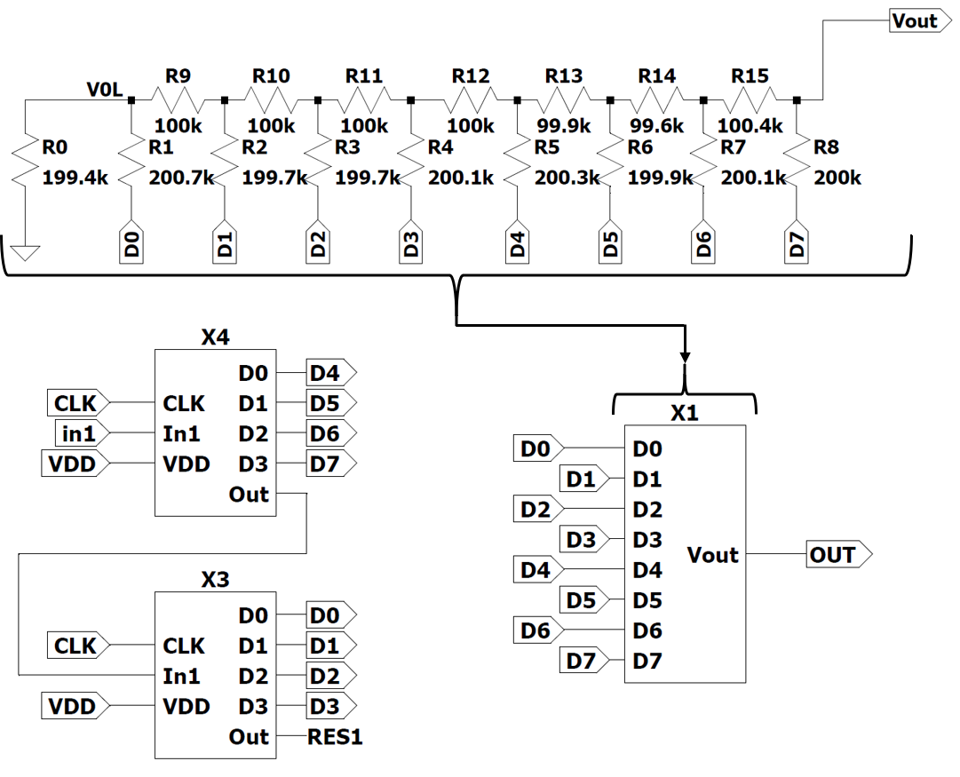 a model of the 8-bit DAC was generated using the LTSpice software.