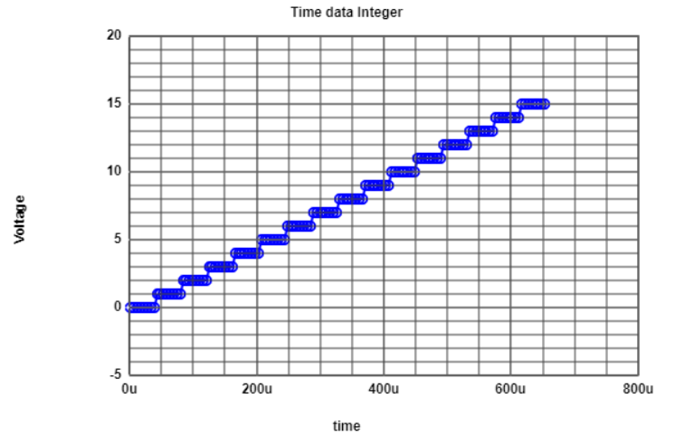 A look at around 175us shows a jump of the voltage from 2V to 4V. Before and after the jump the voltage stays the same. At around 500us the same behavoir occurs again. At timestep 325us a jump of 4V is measured. At this timestep the D3 input changes his value for the first time. Because of the change of the resistances only 12 different voltage values at the time data scale are possible to generate.