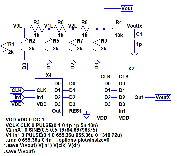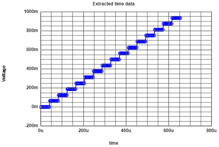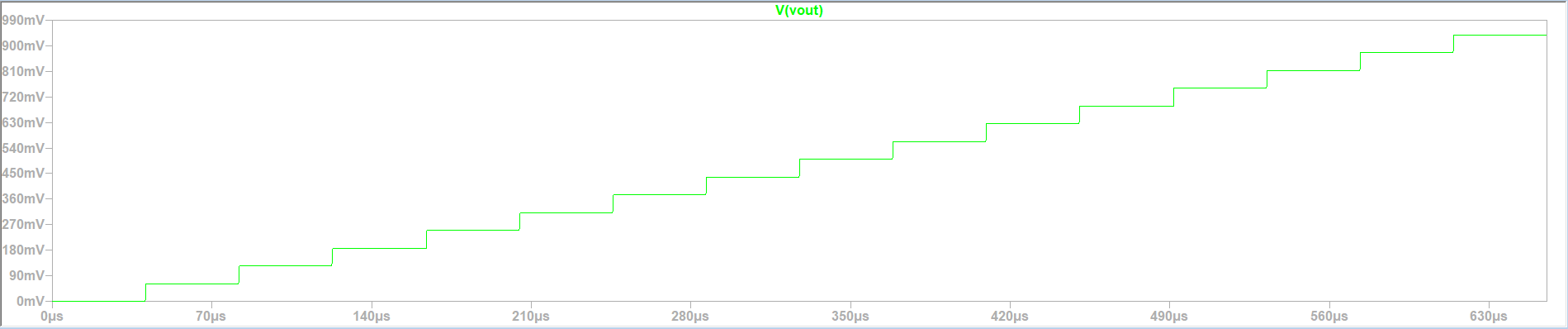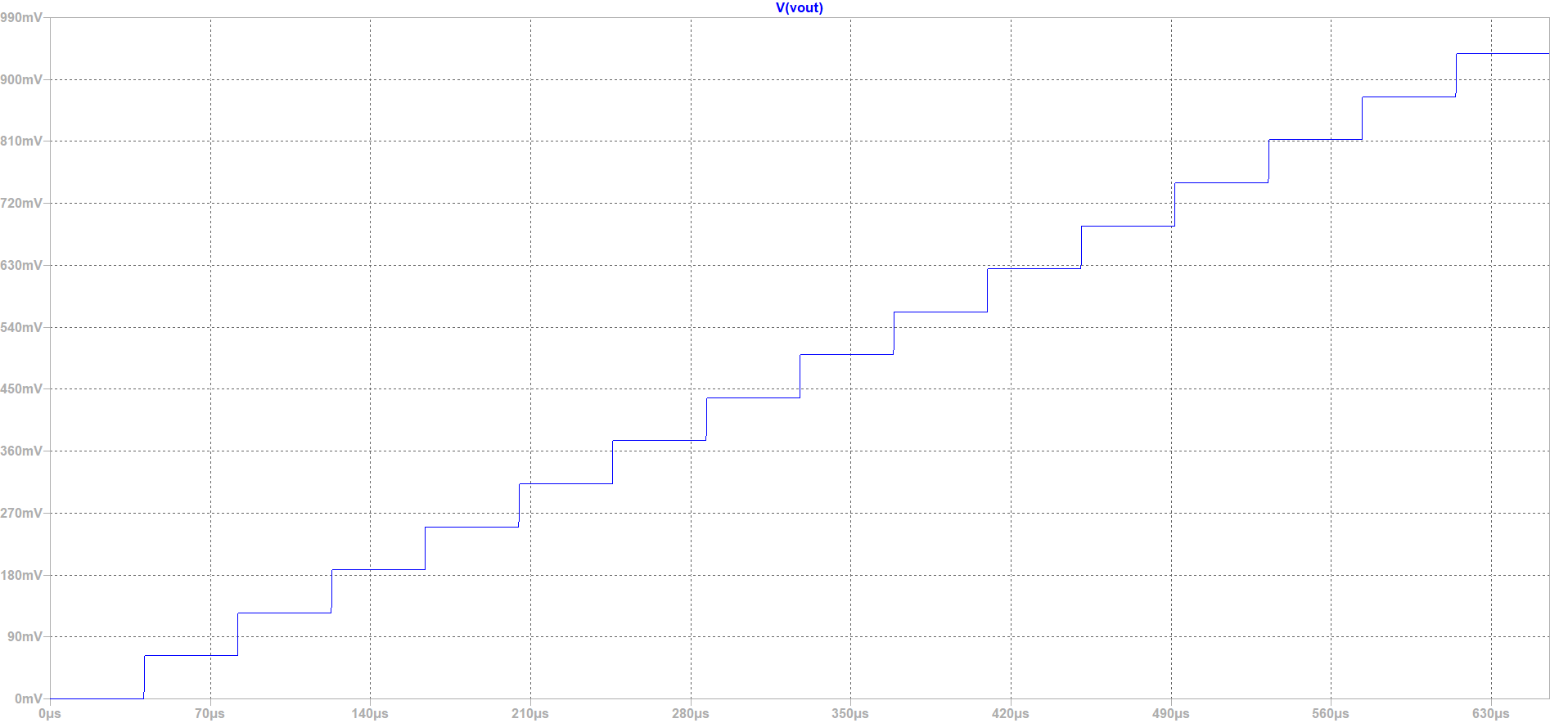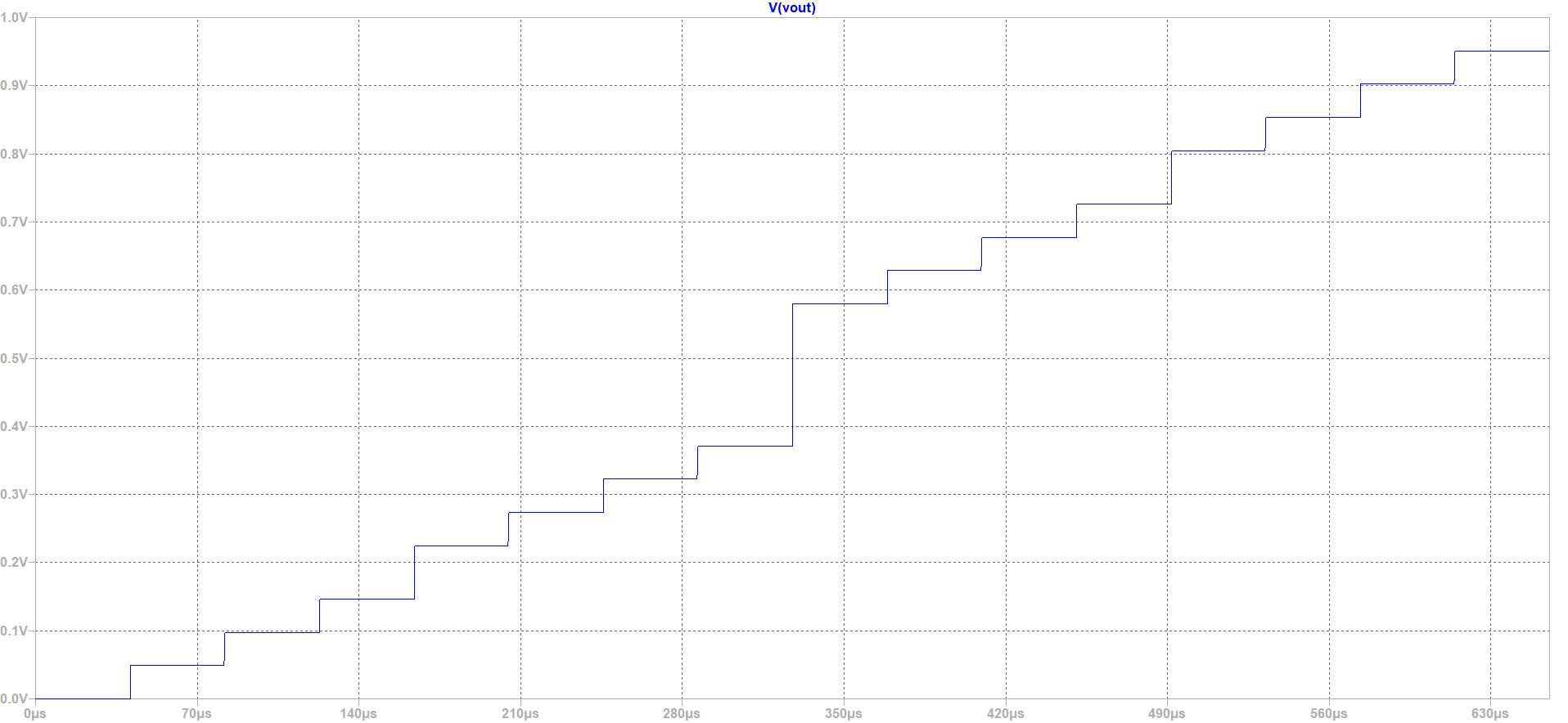 The quantization is clearly visible in the picture. The first step of the ramp represents the signal 0000, the next step 0001 up to 1111. D0 changes Vout from 0 to Vdd/2^n (n number of bits). In our case the influence of D0 is 0.0625V. D1 influences the output voltage with the value of Vdd/2^(n-1). In the end the voltages are added up at the output voltage.