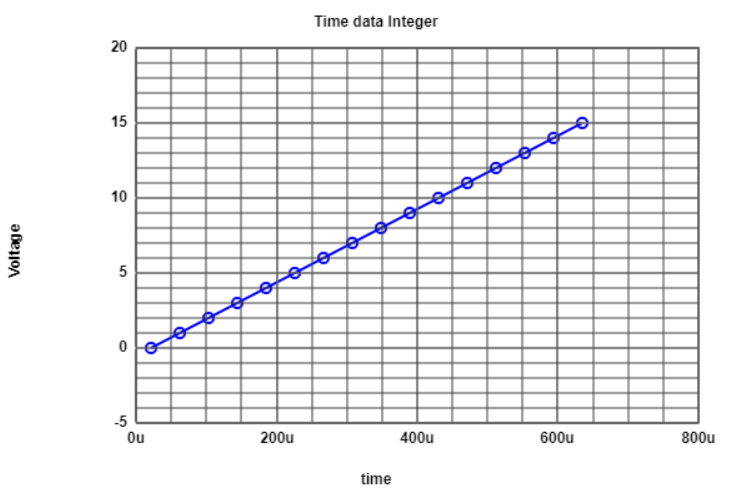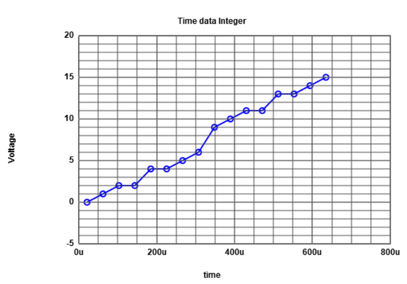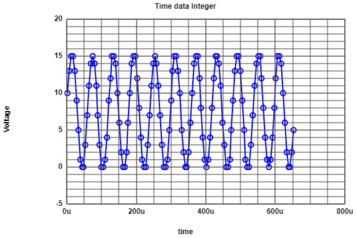 The javascript tool 'Read Raw File' also gives us the posibility to map the voltage to a code. Therefore we need to specify the number of the highest code which is 15 (range is from 0 to 15). After clicking on the 'Map to integer' button the tool shows us the desired graph which should look similar to the one before.