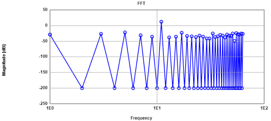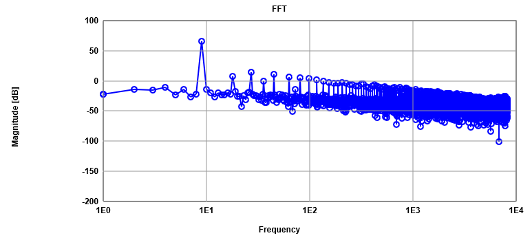 The fast fourier transformation shows an decrease in magnitude for higher frequencies. There is one point at around 9Hz which indicates a very high magnitude. The system has an low pass filter behavoir, shown with the decrease of the magnitude for high frequencies.