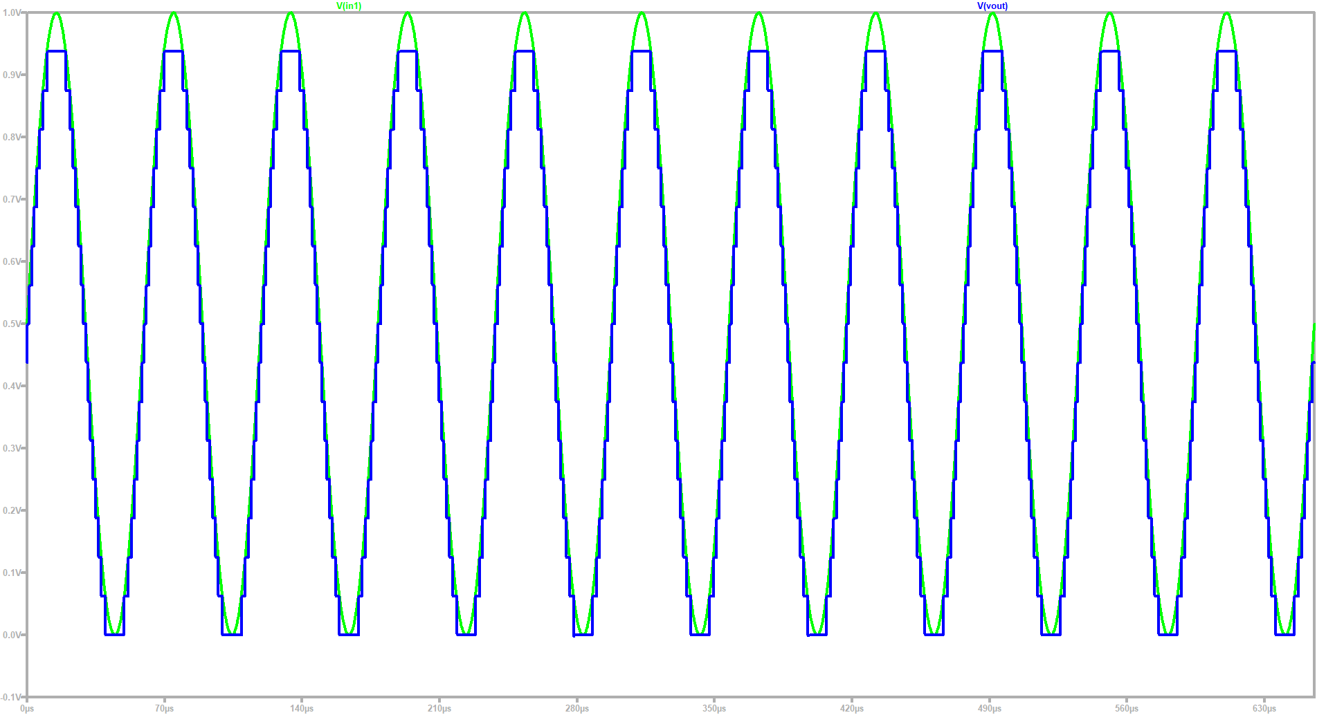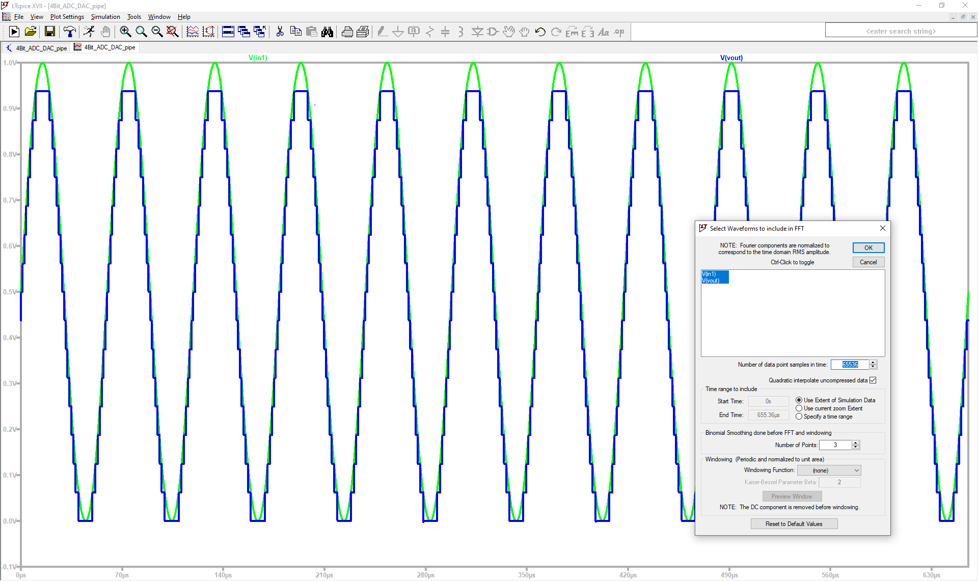 The AC block shall convert an analoge sine signal into digital which the DAC converts into analoge, as shown by simulation in the graphic next to the circuit.
