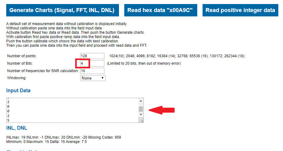 First, the copied values must be pasted in the "Input data" box. The "number of bit" box value has to contain 4, which correspond to our the number bits of the converters.