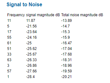 Aditionally, a true INL and DNL is obtained and a Signal to Noise table is computed as shown below.