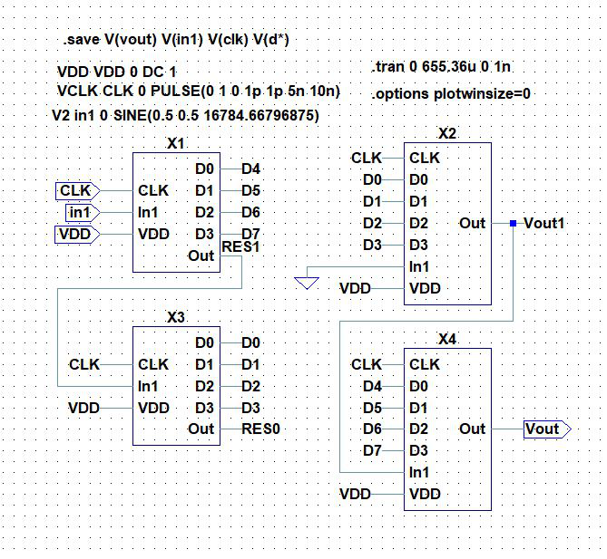 was created in LTSPICE. Ramp and sine tests were simulated in the program and FFT, INL, DNL