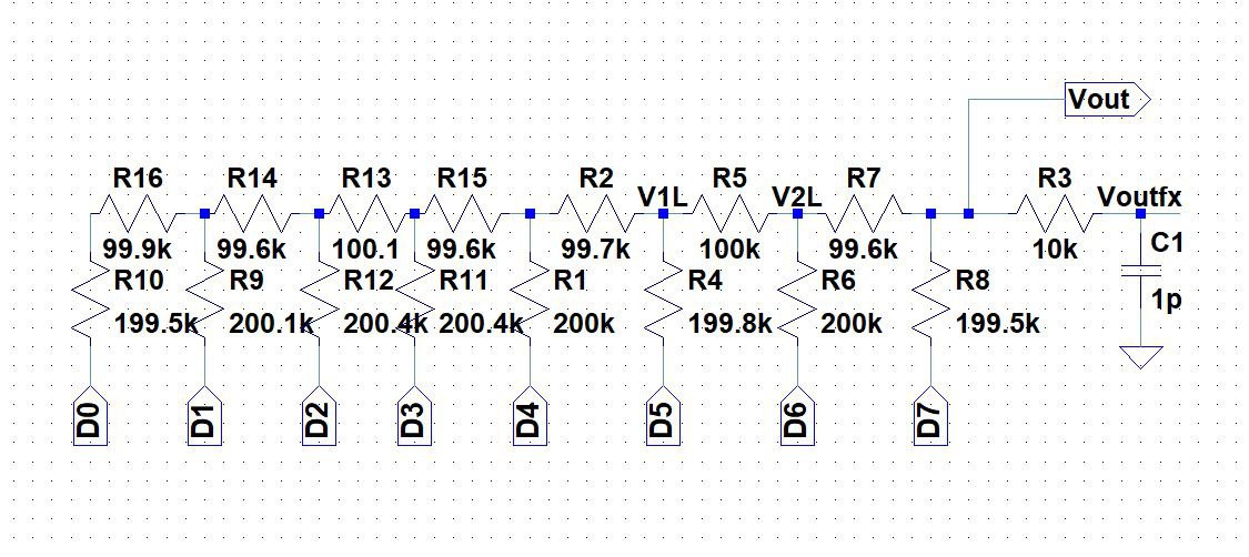 A 8-bit R2R DAC was built in LTSPICE with the measured resistance values.