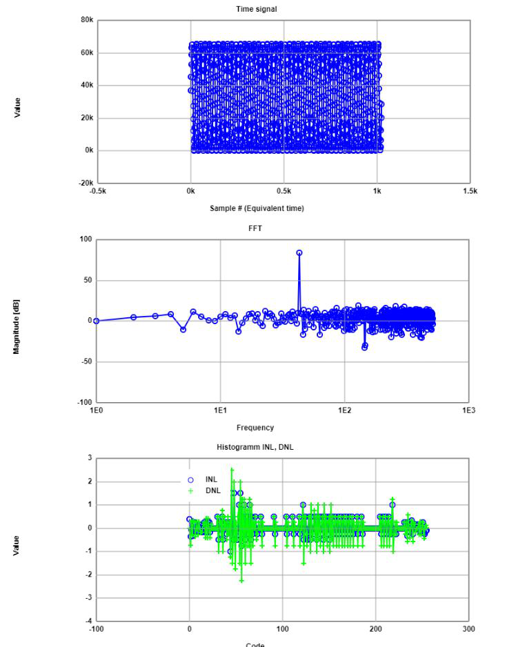 of FFT, INL, DNL and SNR were documented and analysed. For circuitry analysis the ramp and sine