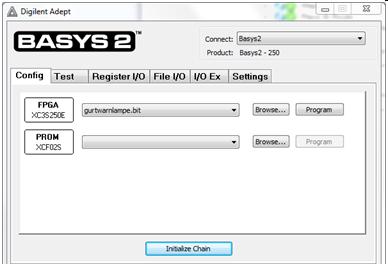 15 | Verbinden Sie-falls noch nicht geschehen-, das BASYS 2 board per USB mit dem Rechner. Starten Sie nun die Software Adept. Wird „Initialize Chain“ mit der Meldung „Initialization complete“ abgeschlossen, dann ist die Kommunikation zwischen BASYS 2 und dem Rechner o.k. Per „Browse“ (obere Zeile) wechseln Sie in ihr Projektverzeichis und laden das .bit File. Eine Warnung wg. der „Startup clock…“ bestätigen sie mit „Ja“. Dann click auf „Program“ und das FPGA ist konfiguriert. ![]() |