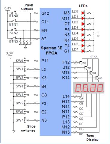 3 | Implementierung der Schaltung auf dem Board Die Logikschaltung wird in eine Netzliste und ein Bitfile umgewandelt. Das Bitfile wird auf das Board transferiert. Alle möglichen Schalterstellungen werden ausprobiert und das Ergebnis auf der Siebensegmentanzeige beobachtet. |