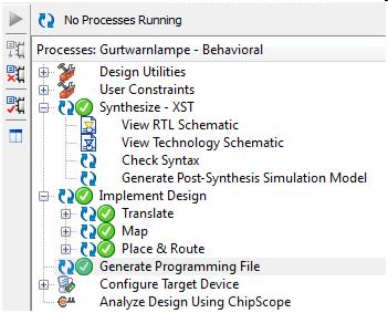 1 | Erstellung eines neuen Projektes mit ISE-Webpack Auswahl des Zielsystems in den Projekteigenschaften. Hinzufügen der Logikbeschreibung mit Hilfe von vorbereiteten VHDL Dateien. Hinzufügen der Anschlussbelegung mit Hilfe einer UCF Datei. Auswahl der Hauptdatei (root). |