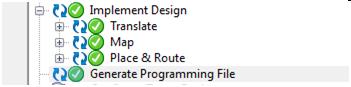 12 | Wechseln Sie auf die Ansicht Implementation. Wählen sie das root Modul gekennzeichnet durch die drei Vierecke aus. Nun findet sich im mittleren linken Fenster die Option "Generate Programming File". |