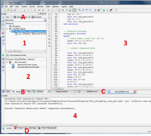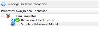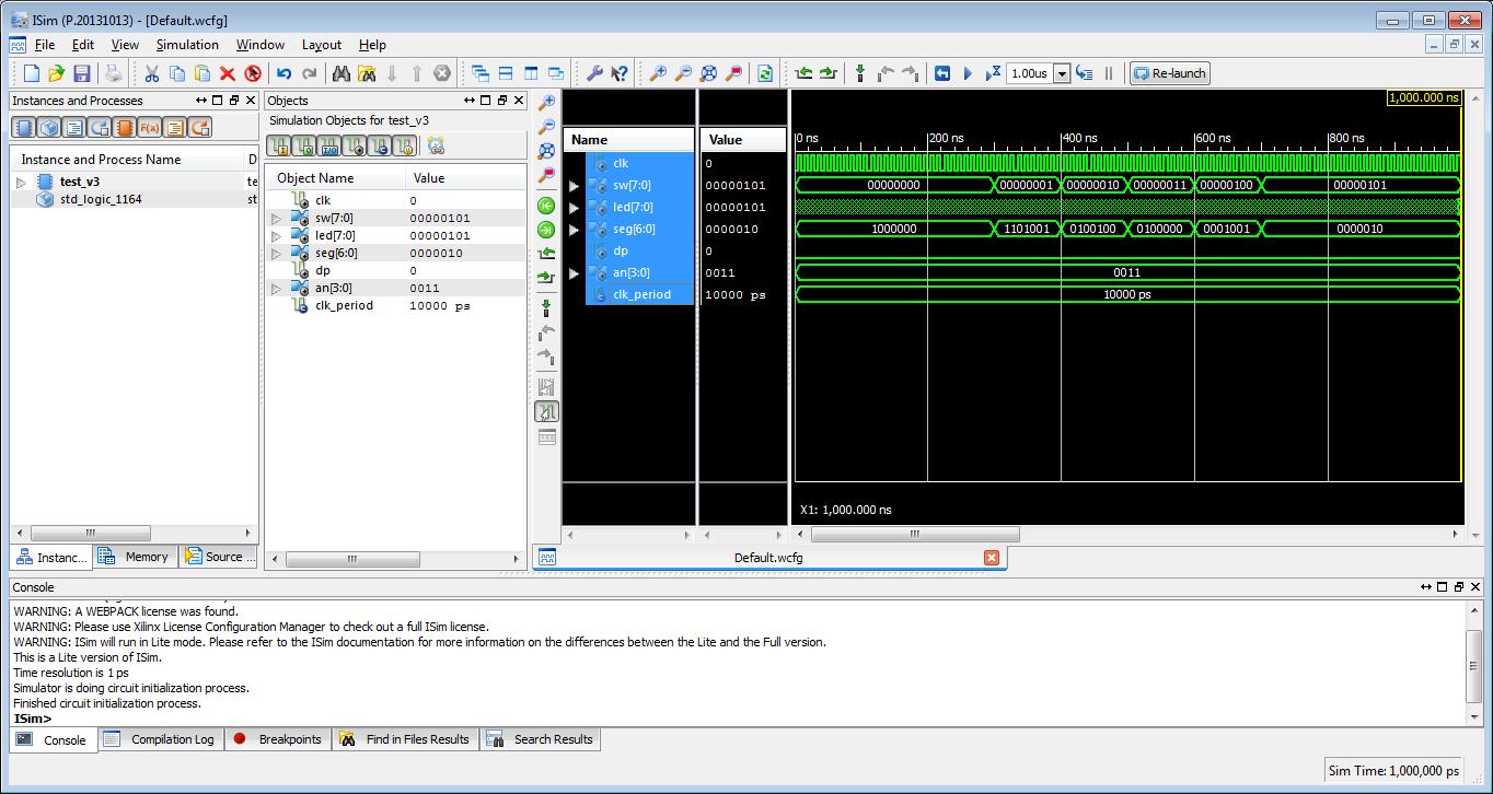 10 | Starten Sie die Simulation, indem Sie mit der Maus Test_V3 anwählen. Im linken mittleren Fenster gibt es nun die Option: "ISIM Simulator" und nach Klick auf das "+" plus Zeichen "Simulate Behavioral Model". ![]() Durch Doppelklick starten Sie den Simulationsprozess, der ein zweites Fenster öffnet. Sie sollten nun ein ähnliches Bild wie unten sehen. Startet der Simulationsprozess nicht, wird mit der rechten Maustaste über "Simulate Behavioral Model" "Rerun All" gestartet. ![]() Mit dem Knopf ![]() Mit dem Knopf ![]() Mit dem Knopf ![]() |