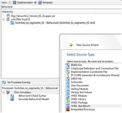 8 | Erzeugen Sie nun eine neue Simulationsdatei. Rechtsklick auf Ihr VHDL Modul: New Source -> VHDL Testbench Tragen Sie als File name: Test_V3 ein und drücken Sie next. Bei „Associate Source“ wählen Sie das Modul VERSUCH3 aus. (next, finish) ![]() Es erscheint der Quelltext für die Simulation. |