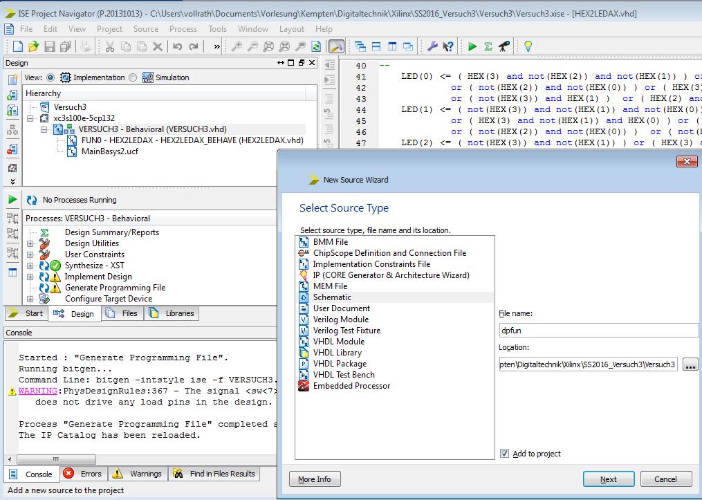 Programmierfile für das FPGA-Board:![]() Sie finden nun im Projektverzeichnis eine Datei VERSUCH3.bit. File, Open, All Files, sortieren nach Typ. Kopieren Sie diese Datei auf das H: Laufwerk und übertragen Sie diese im nächsten Schritt zu Ihrem Board. |