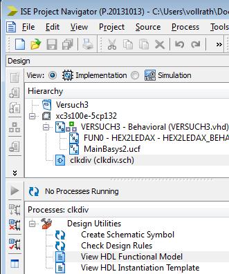 9 | Dazu gehen Sie zum Reiter "Design", wählen clkdiv.sch aus und erzeugen mit "View HDL Instantiation Template" den zugehörigen VHDL code, um die Schaltung einzubauen. ![]() |