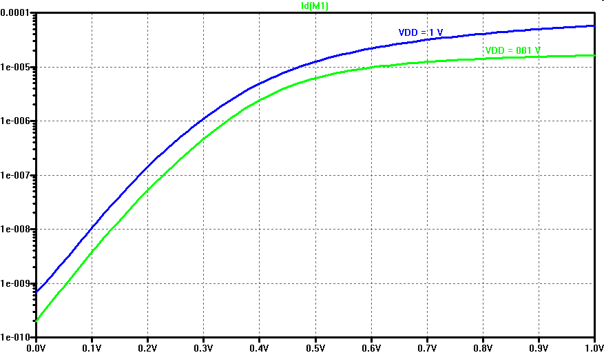 The graph shows an increase in current by a factor of 10 for 100 mV change in VGS.