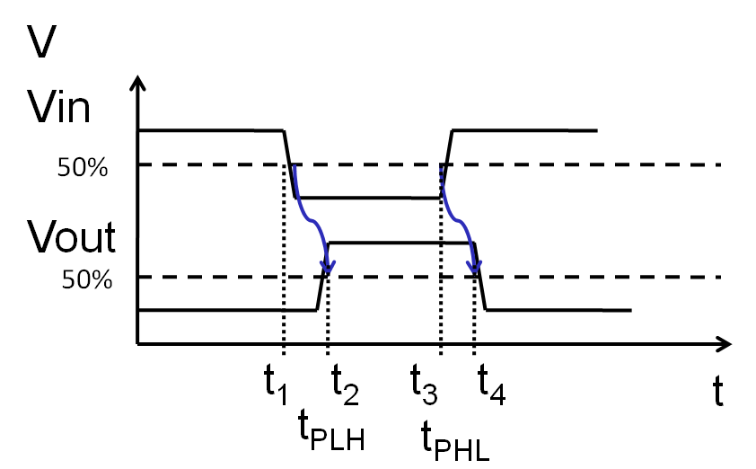Propagation Delay tP: Blue arrow Different between rising and falling edge. Different active transistors. |
