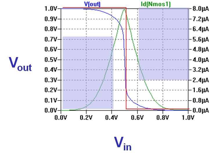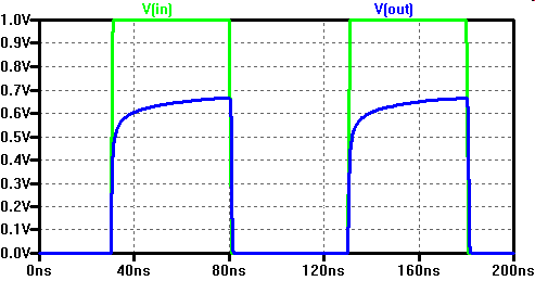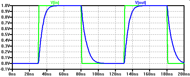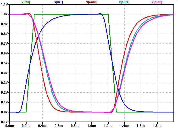 VIn0 In0 0 PULSE(0 1 0.2n 0.1n 0.1n 0.9n 2n) VIn0b In0b 0 PULSE(1 0 71p 0.1n 0.1n 0.9n 2n)In0b is the inverted signal of In0. It starts 129ps earlier than In0 to compensate for the delay of the first inverter.
