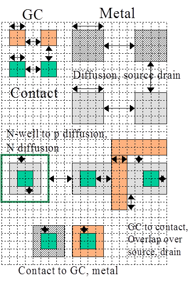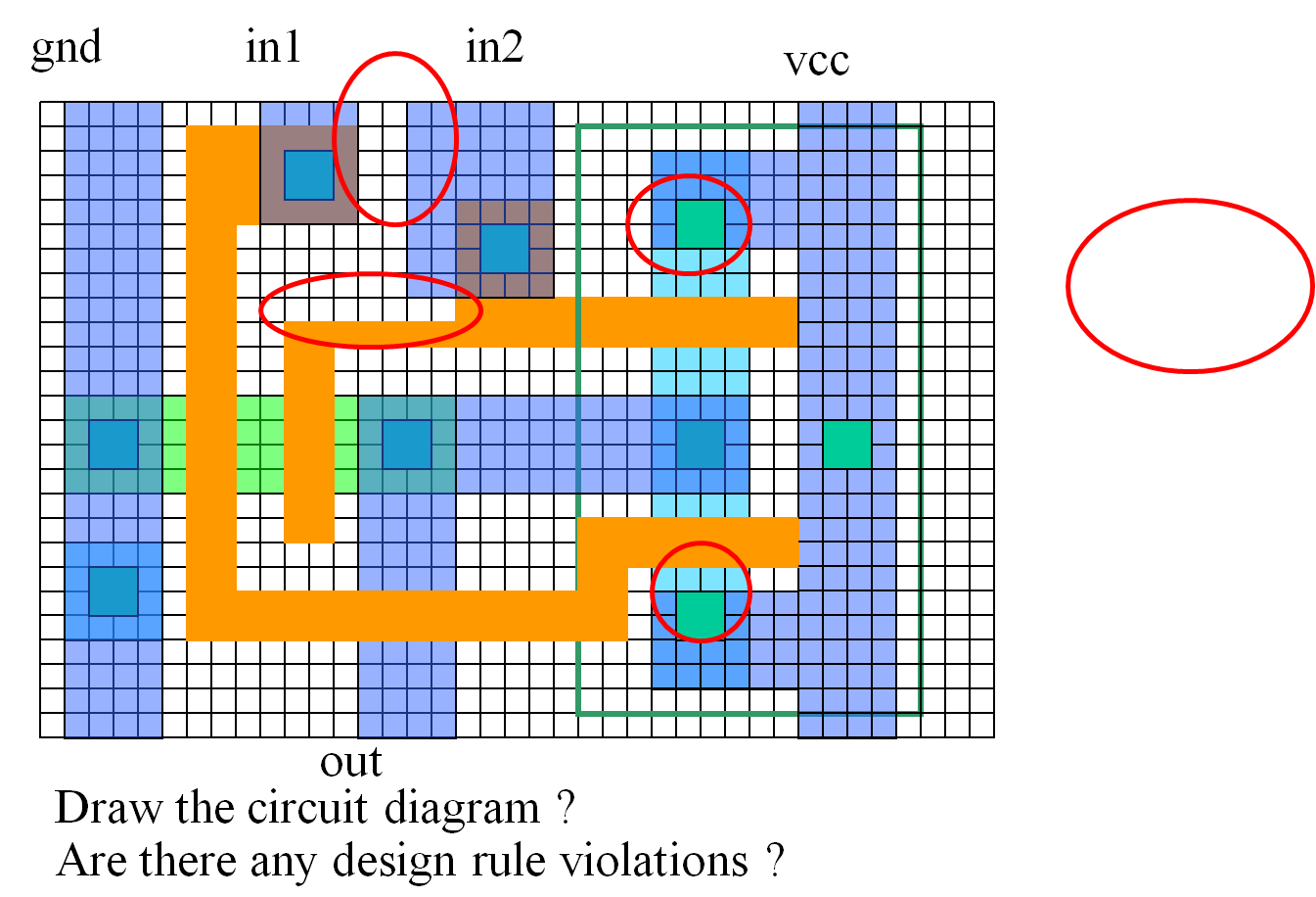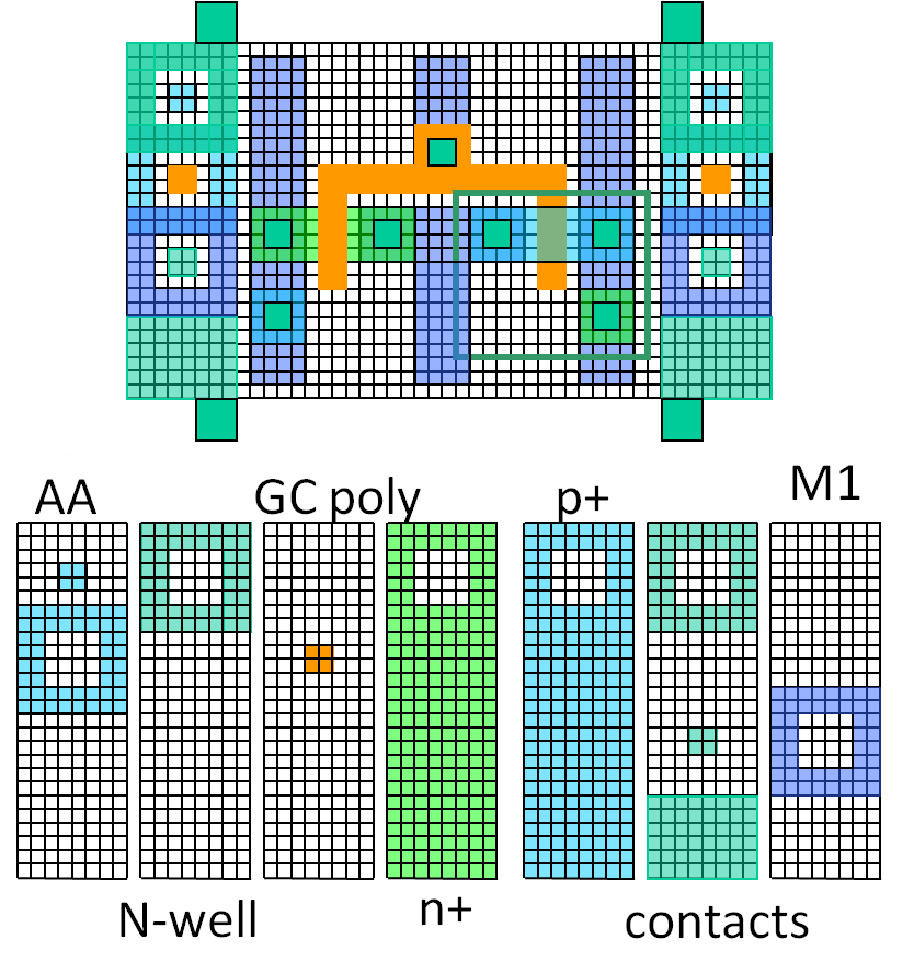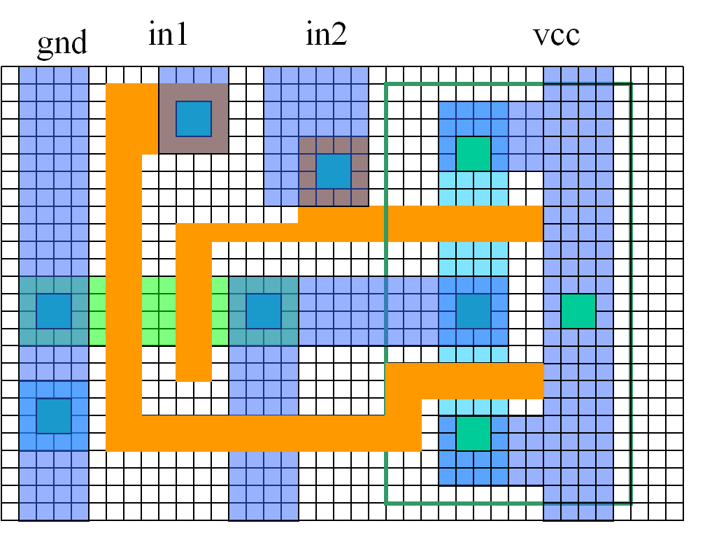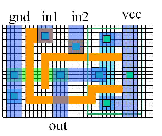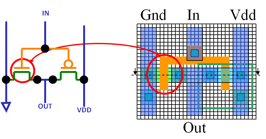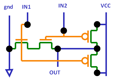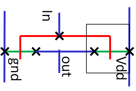 Layers, different color: Connection: metal (blue), polysilicon (orange,pink), contact (black) Transistor: crossing polysilicon and n- or p-diffusion (green) |