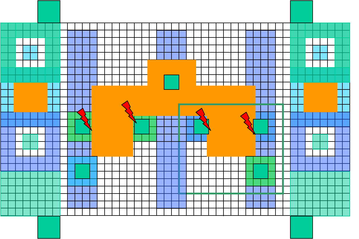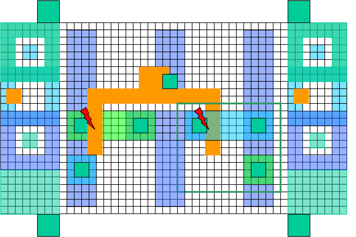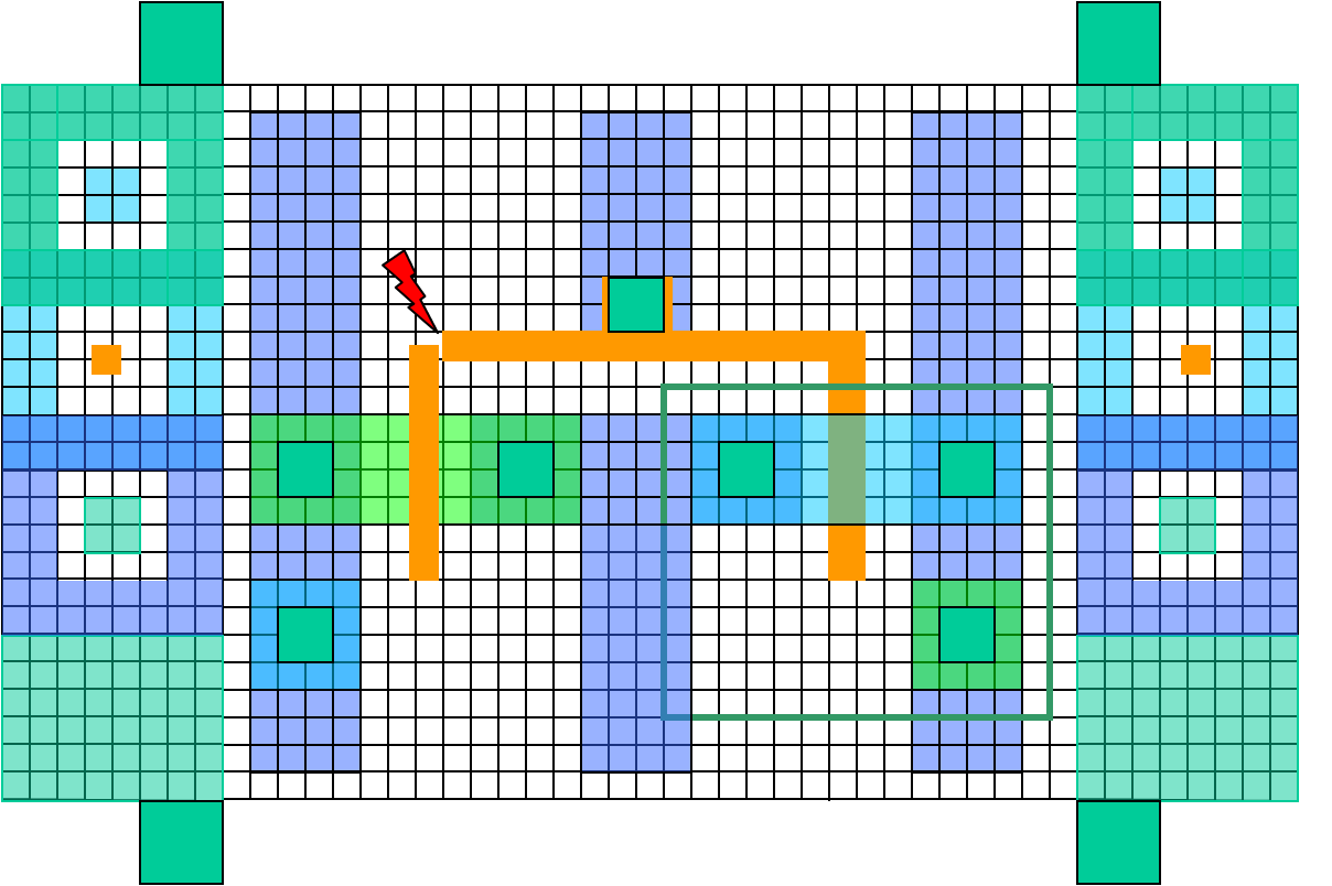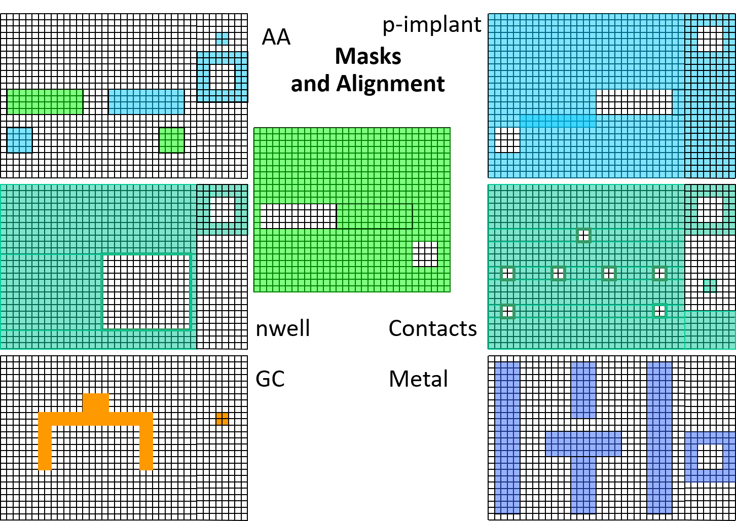 Layers, different color: Connection: metal (blue), polysilicon (orange,pink), contact (black) Transistor: crossing polysilicon and n- or p-diffusion (green) |