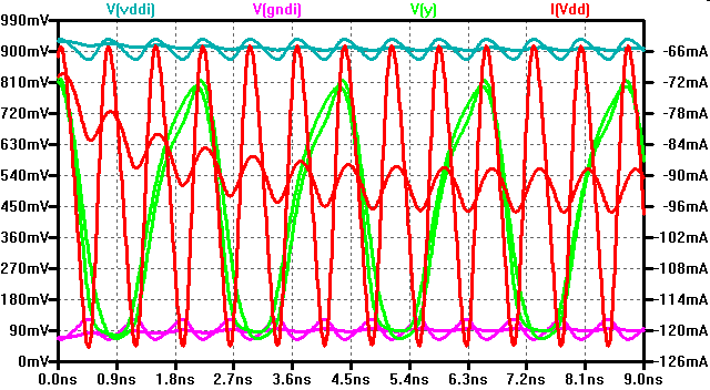 The voltage level of gnd and vdd shows a ringing due to changing IDD.