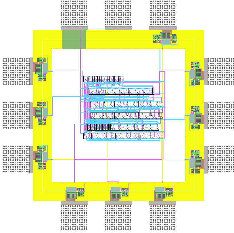 This example shows the pad frame not the active area to limit minimum chip size.