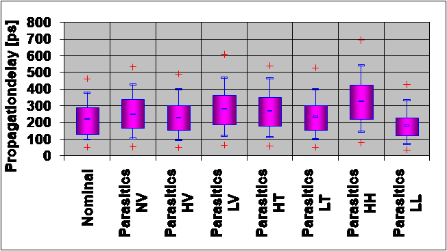 temperatur (HT high temperature, LT low temperature) and parasitics on propagation delay.