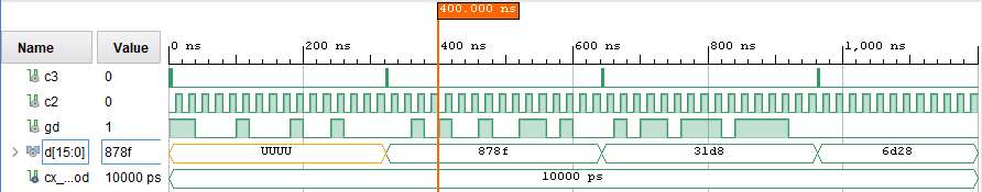 In the Vivado simulation 3 correct 16-bit output values d[15:0] can be seen.