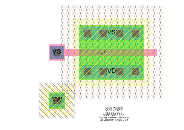 Mpmos@0 pmos@0_diff-bottom VG VD vdd P L=0.4U W=4U AS=37.5P AD=32.5P PS=27.5U