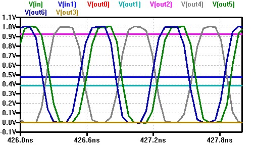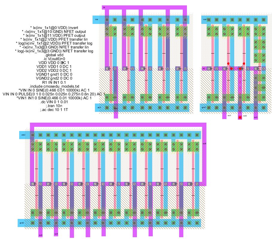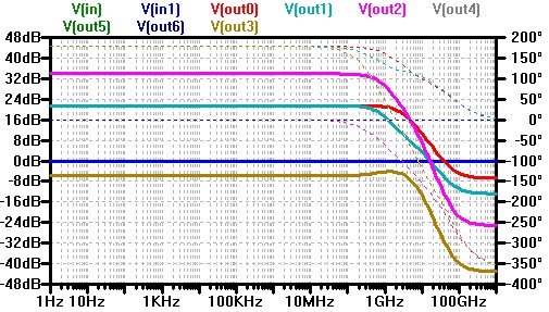 VIN IN 0 SINE(0.466 0.01 10000k) AC 1 .ac dec 10 1 1TV(out0): output inverter, no load ft 40GHz, a = 22dB V(out1): load inverter ft 16.8 GHz, a = 22 dB |