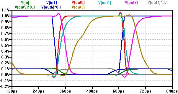 Ring oscillator: Cycle time 650 ps 11 stages (60ps per stage) VIN IN 0 PULSE(0 1 0 0.025n 0.025n 0.275n 0.6n 20) AC 1 .tran 10n Delay: Nominal 1x: 2.5 Cox HL: 22 ps, LH: 28 ps; Load 3x: 5.5 Cox 32ps, 46 ps |