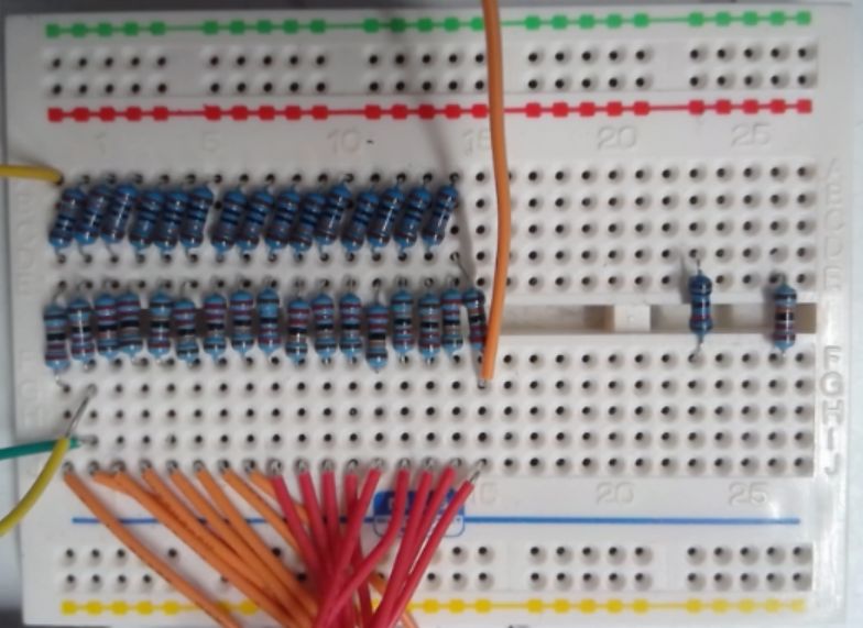 16 Bit R2R DAC: left side output D15 connected to scope 1, right side D0 and GND connection.