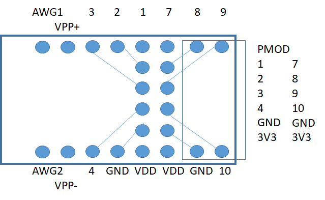 Pins AWG: JC upper 8 Bit 10,9,8,7,4,3,2,1; JB lower 8 Bit 10,9,8,7,4,3,2,1;