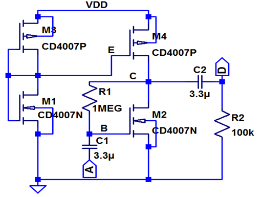.model CD4007N NMOS(LEVEL=1 KP=500u VT0=1 LAMBDA=0.002 CGSO=45n CGBO=2n CGDO=45n) .model CD4007P PMOS(LEVEL=1 KP=500u VT0=-1 LAMBDA=0.002 CGSO=45n CGBO=2n CGDO=45n)