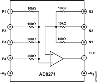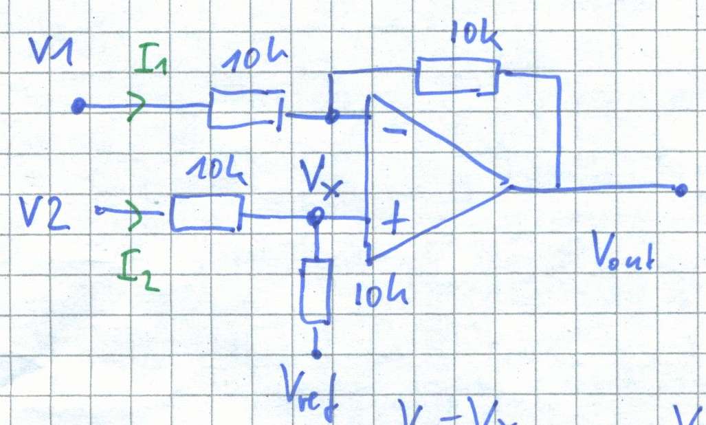AD8271\( V_x = \frac{V_2 - V_{ref}}{2} + V_{ref} \) \( V_x = \frac{V_2}{2} + \frac{V_{ref}}{2} \) \( \frac{V_1 - V_x }{R} = I_1 = \frac{V_x - V_{out} }{R} \) Vout = 2 Vx - V1 Vout = V2 + Vref - V1 Schalterstellung 1 (hoher Pegel Vin): Vout = Vin + Vref - Vref = Vin Schalterstellung 2 (niedriger Pegel Vin): Vout = Vvref + Vvref - Vin = 2 Vvref - Vin |