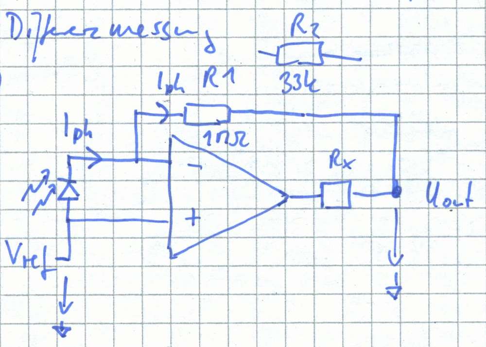 TIA AmplifierR1 = 1 MOhm, VDD = 5V, Vref = 2.5 V Uout(IPh) = - IPh · R1 + Vref \( I_{Phmax} = - \frac{U_{out} - V_{ref}}{R_1} = - \frac{V_{DD} - V_{ref}}{R_1} = - \frac{2.5}{10M \Omega} = 2.5 \mu A \) |