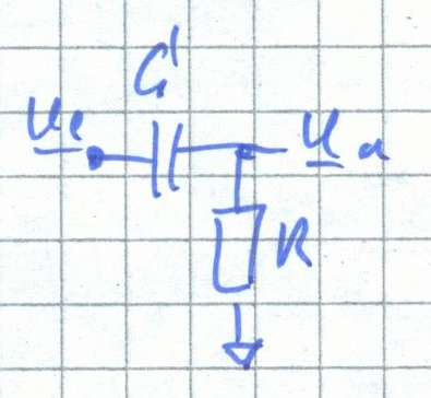 HochpassC = 0.22 µF, R = 10 kΩ \( \frac{\underline{U_a}}{\underline{U_e}} = \frac{R}{\frac{1}{j \omega C} + R } = \frac{j \omega C R}{1 + j \omega C R } \) \( f = \frac{1}{2 \pi C R } = 72.3 Hz \) |