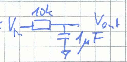 TiefpassC = 1 µF, R = 10 kΩ \( \frac{\underline{U_a}}{\underline{U_e}} = \frac{\frac{1}{j \omega C}}{R + \frac{1}{j \omega C}} = \frac{1}{1 + j \omega C R } \) \( f = \frac{1}{2 \pi C R } = 15.9 Hz \) |