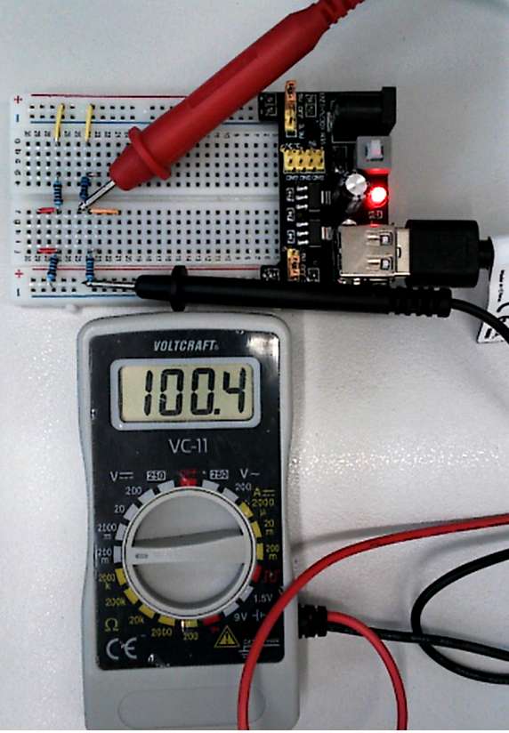 Um Ströme zu messen werden Messwiderstände von 100 Ω verwendet. Diese Schaltung kann man auch aufbauen und mit einem Multimeter messen. Die Messwiderstände verändern Spannungen und Ströme der Schaltung. |