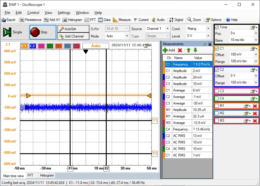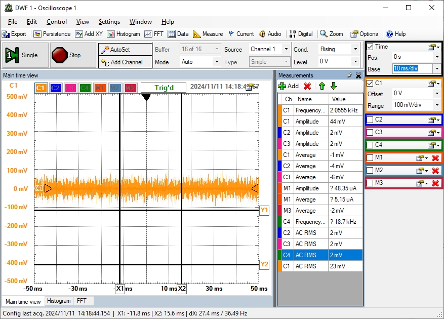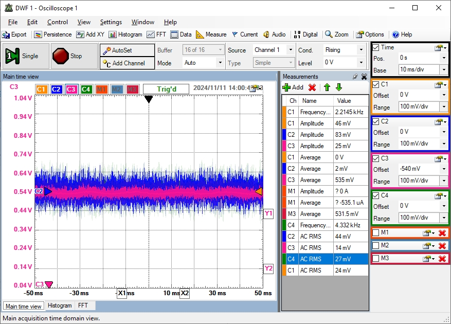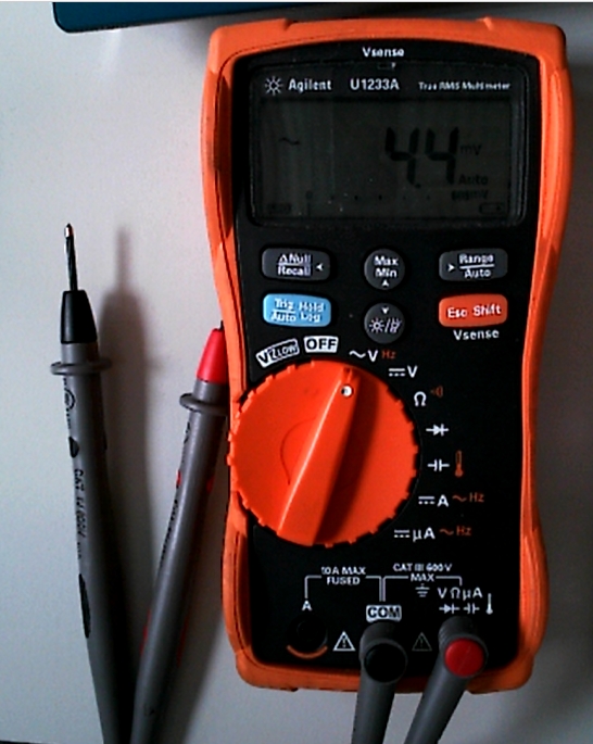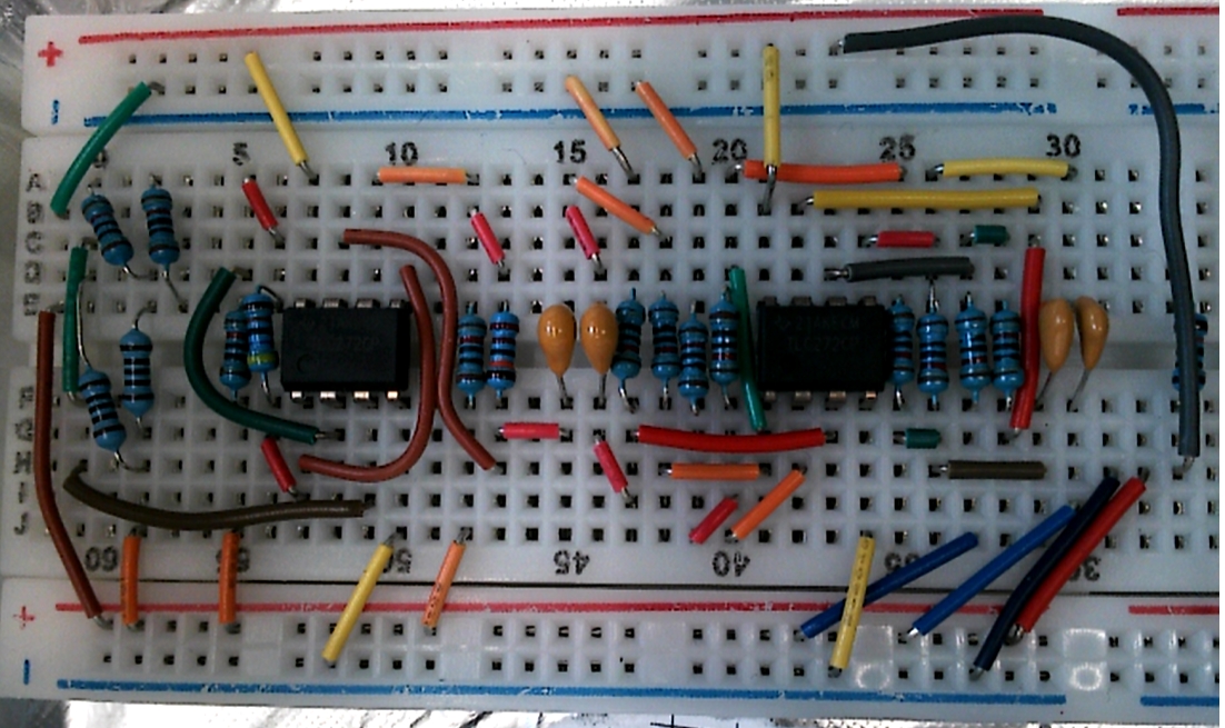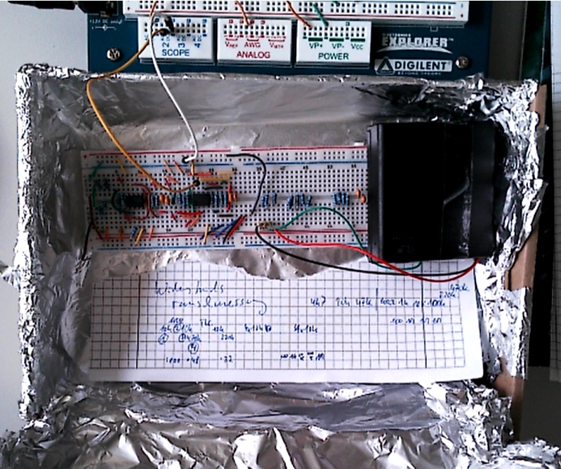 Mit einer Verstärkung von vu = 4416 und einer Bandbreite von fbw = 20 kHz konnten bei Widerständen von 10 kΩ..100 kΩ Effektivwerte zwischen 16..30 mV gemessen werden. |