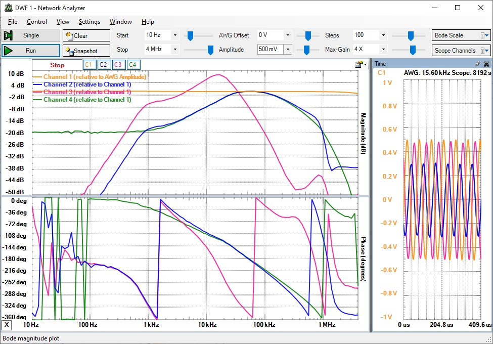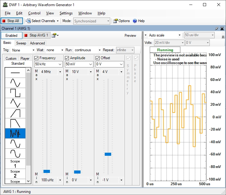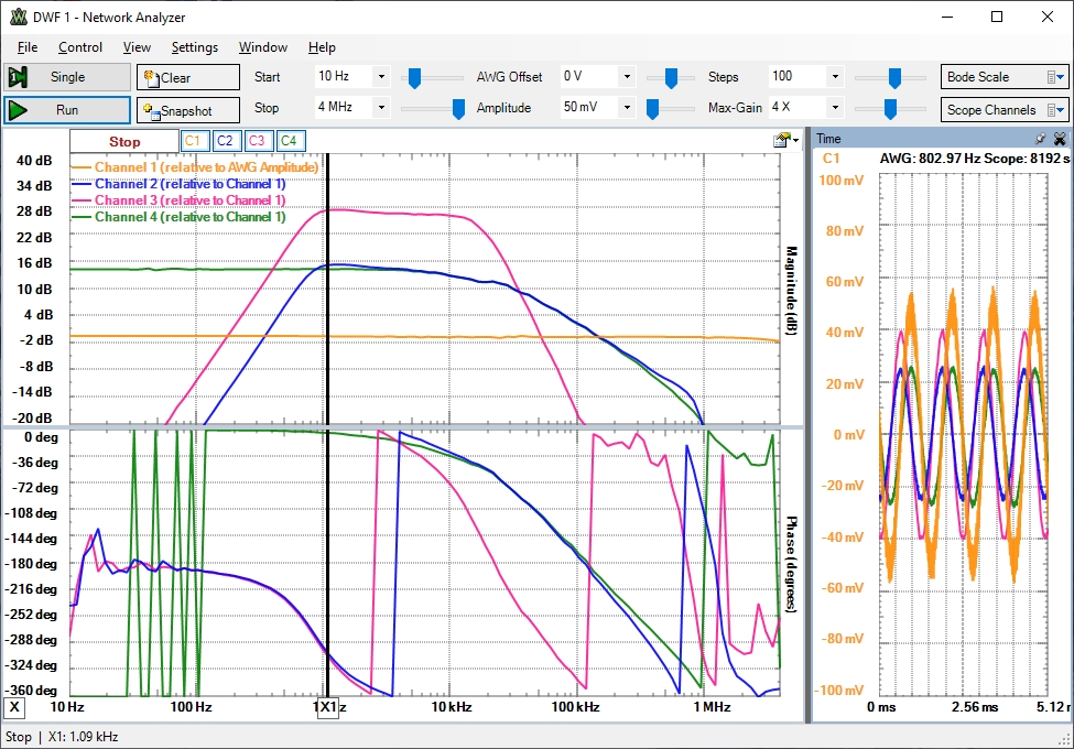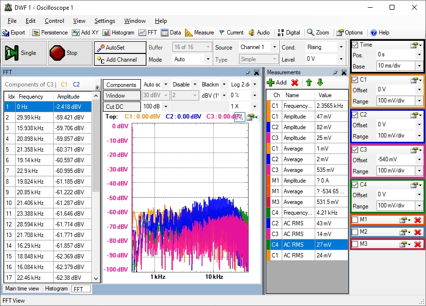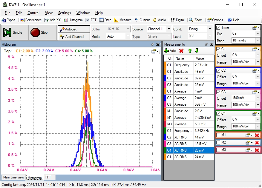 Mit einer Verstärkung von vu = 4416 und einer Bandbreite von fbw = 20 kHz konnten bei Widerständen von 10 kΩ..100 kΩ Effektivwerte zwischen 16..30 mV gemessen werden. |