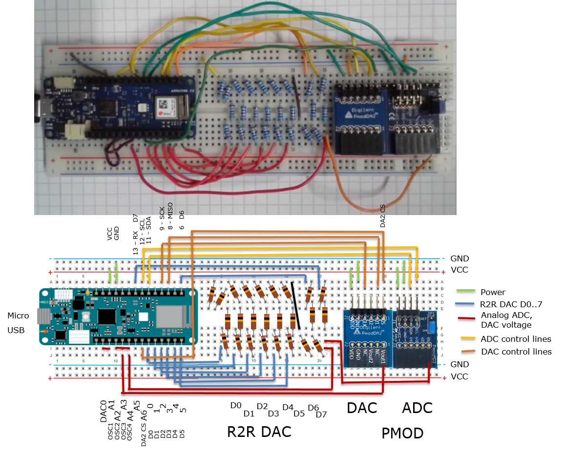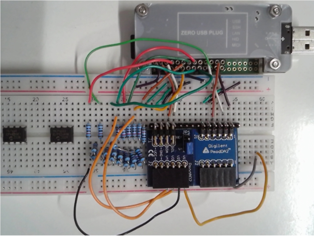 Additional ADC and DAC are realized with Digilent PMOD AD2, Digilent PMOD DA2,