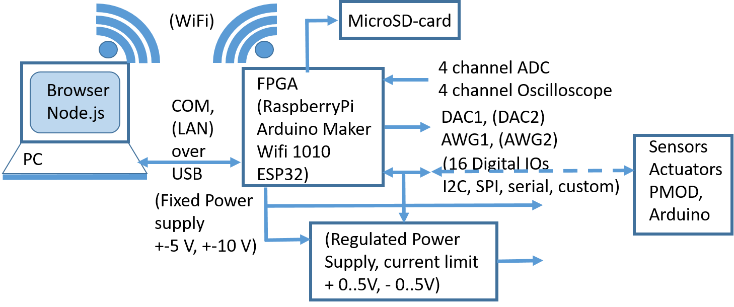 Laboratory PC: NodeJs server on PC, USB connection to Arduino or BASYS 3