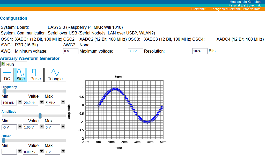 Select AWG: Waveform Sine, frequency, offset 0.5 V, amplitude 0.5 V
