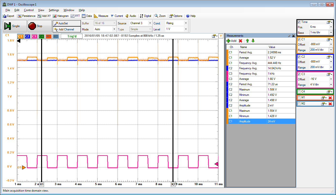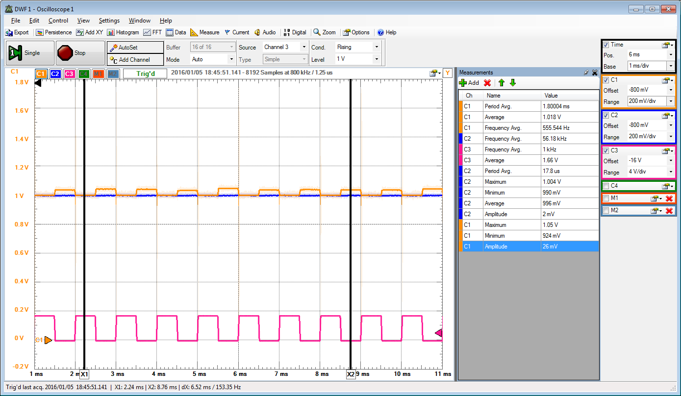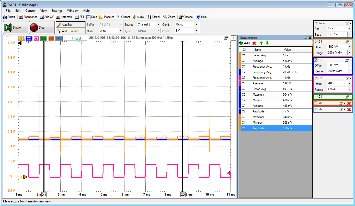 Setup: 1.3ms per 16 Bit sample. Range: -90mV..1.63V