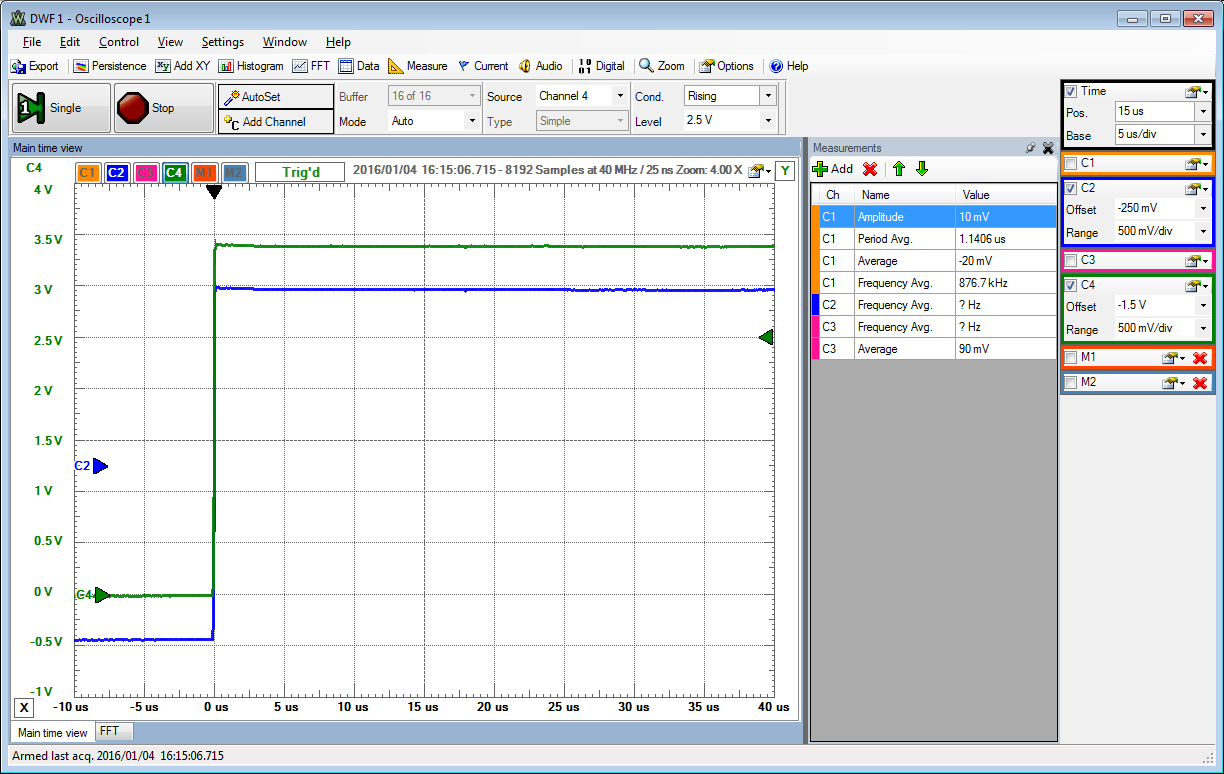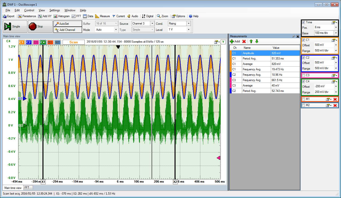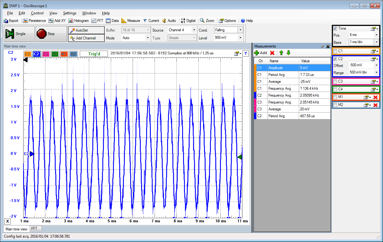 Setup: 1.3ms per 16 Bit sample. Range: -90mV..1.63V