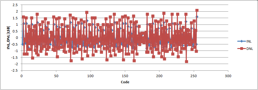 INL is below 4 so uncalibrated 2 Bits are lost giving a resolution of 6 Bits.