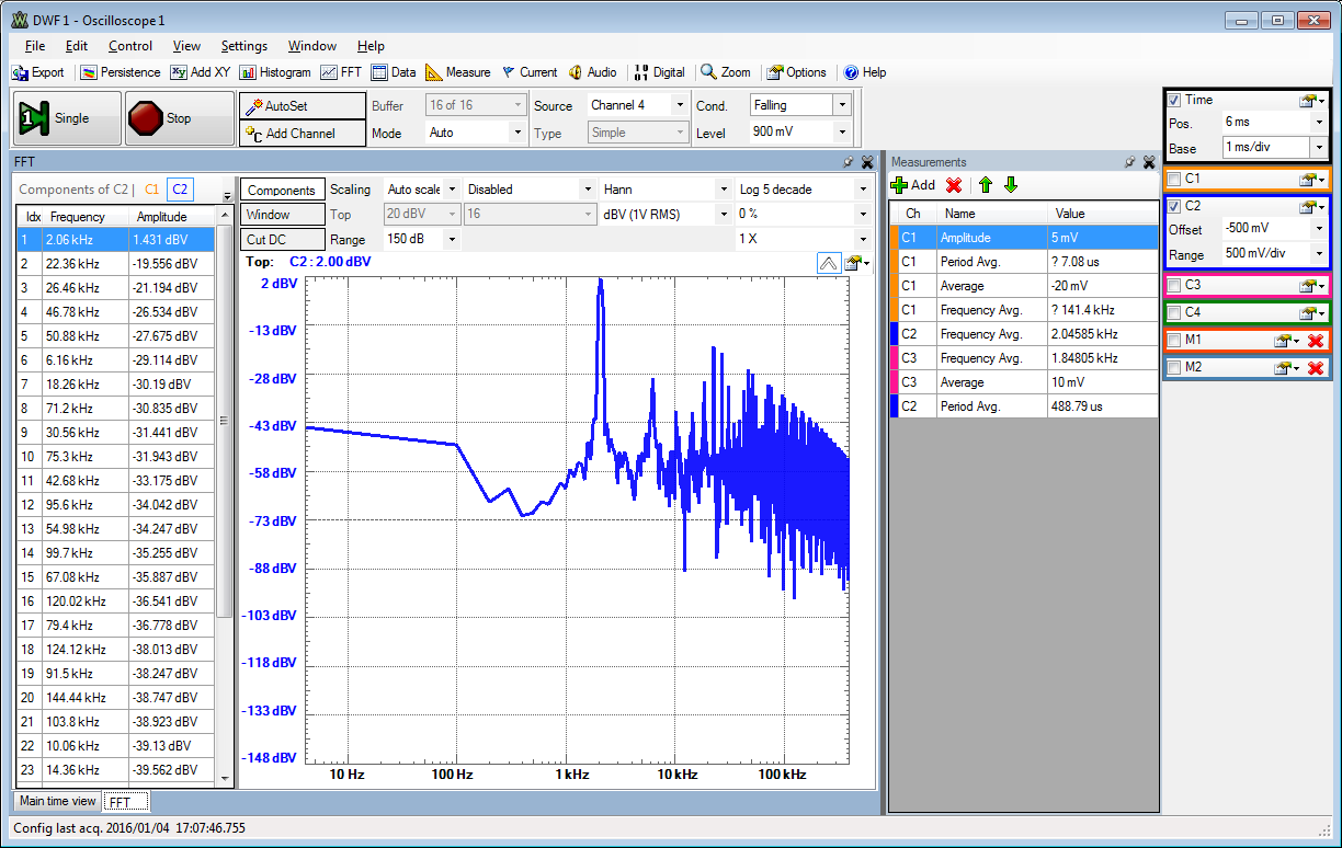 The signal strength is 1.42 dbV at 2.06kHz and the next highest peak is at -19.5 dbV at 22.36kHz.