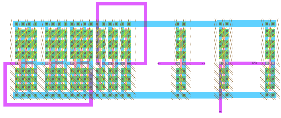 The structure Xinv_3x1@3 has 3 PFETS in parallel L=50nm W=250nm and 3 NFETs in parallel with L =50nm and W=25 nm.