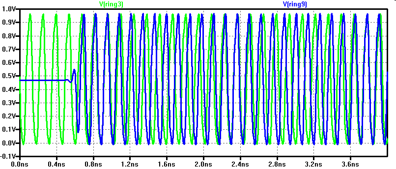 It shows 7 GHz oscillation frequency. With 149uA (Ring3) and 447uA (Ring9) power consumption.